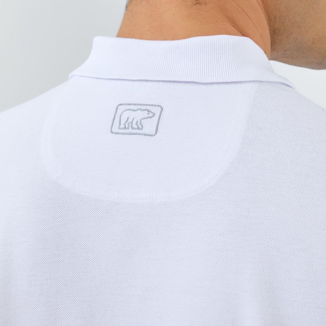 Kerah dan manset lengan memakai rib dengan warna senada tubuh, memberi kesan rapi dan minimalis. Tiga kancing pada plaket serta benang kancing pertama yang disesuaikan dengan warna artwork di bagian belakang menambah detail halus namun berdampak. Di area yoke belakang, terdapat artwork Bear in Frame embroidery—ikon khas yang menguatkan identitas Jack Nicklaus.