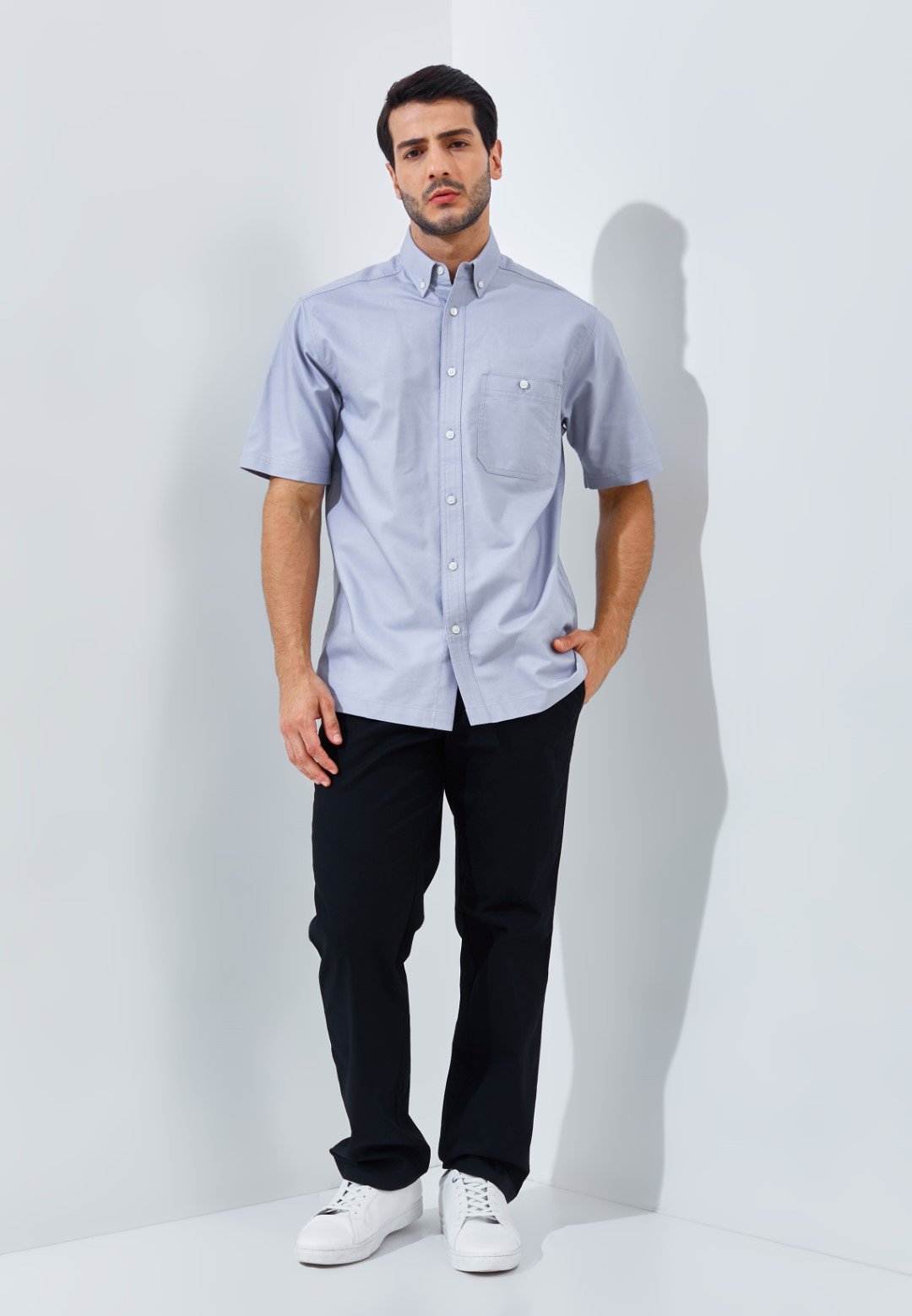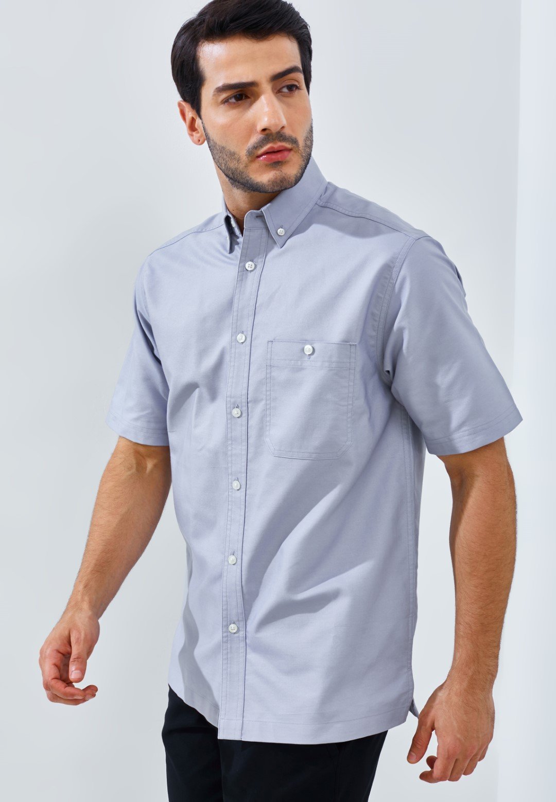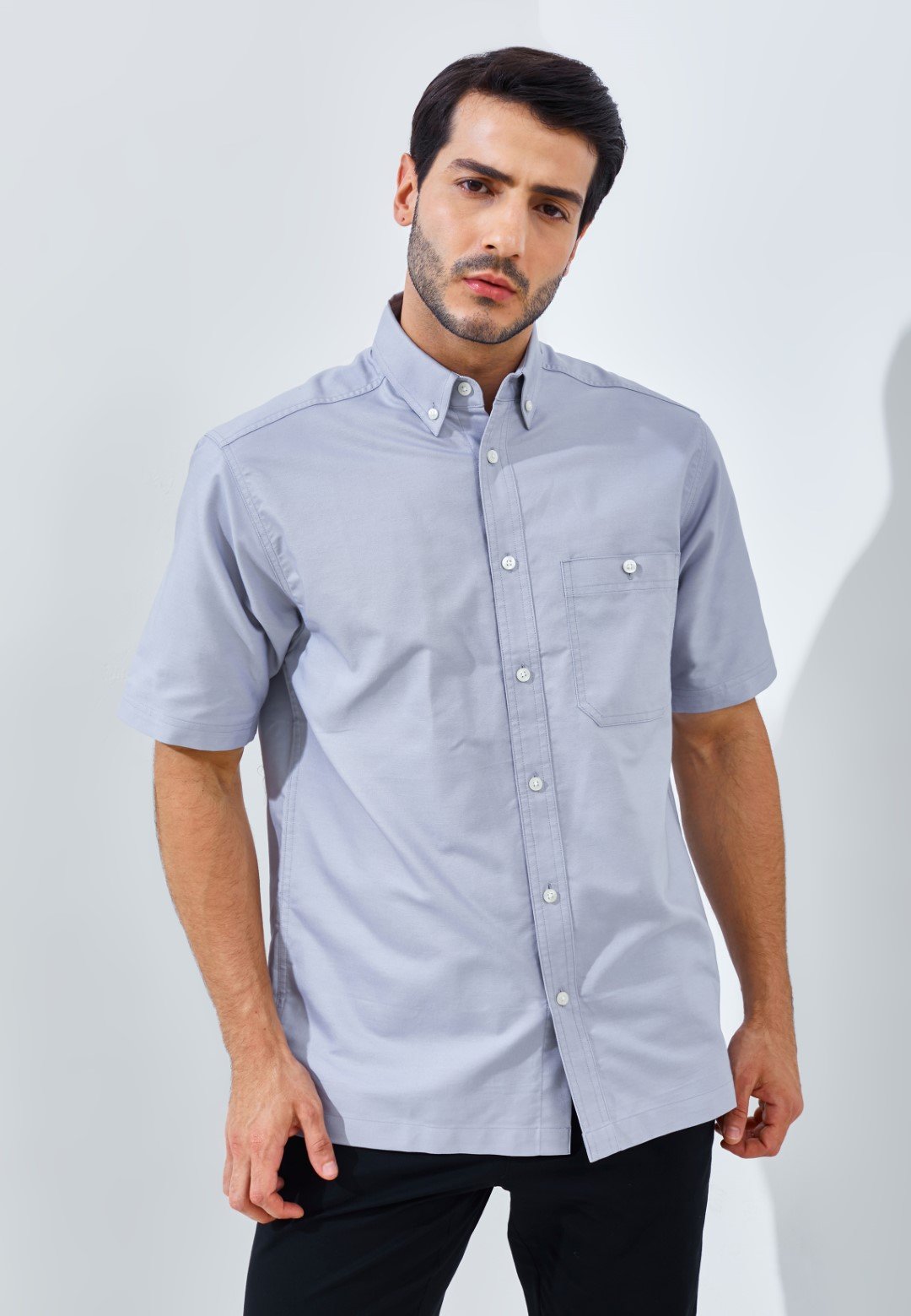 Kemeja lengan pendek motif polos dengan detail kerah standar, terdapat saku disebelah dada kiri, dan Kancing dari bahan premium dengan ketebalan yang dirancang agar terasa nyaman di jari dan mudah dipasang.