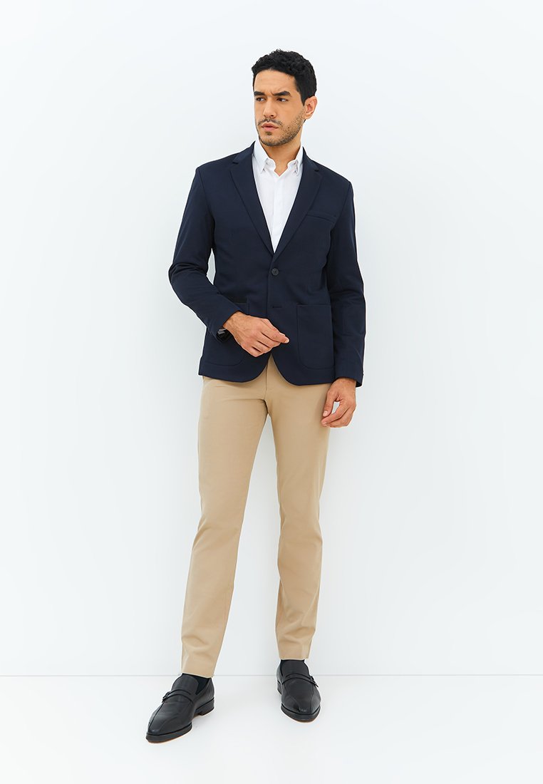 Blazer fitting slim fit, single vent, dan ada kantong kecil contrast color bahan suede.